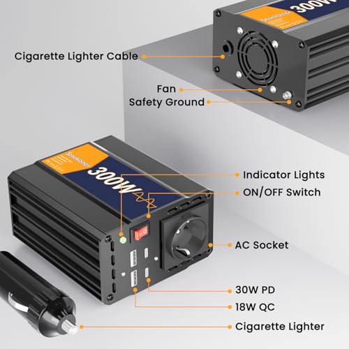 【300W Reiner Sinus Wechselrichter Auto 12V auf 230V】:300W Reine Sinus Wechselrichter wandelt 12V DC in 220/230V AC um (Umwandlungseffizienz >92 %), verfügt über 300W Dauerleistung und 600W Spitzenleistung. Mit 2× 18W USB-Anschlüssen, 2× 30W Typ-C-Anschlüssen und 1× 220V-240V AC-Steckdose. Dieser 12V-Spannungswandler Auto ist perfekt für Autos, SUVs, LKWs, Wohnmobile oder in Notfällen wie Hurrikanen, Schneestürmen und Stromausfällen.Dieser Wechselrichter kann nur für die Zigarettenanzünderschnittstelle des Autos verwendet werden und kann nicht direkt an die Batterie angeschlossen werden. • 【Reiner Sinus Schutz für elektrische Geräte】: Durch die Verwendung der Sinuswellen-Technologie liefert er netzäquivalenten, sauberen, sanften und leisen hochwertigen Wechselstrom, um Ihre elektronischen und elektrischen Geräte zu schützen und deren Lebensdauer zu verlängern. Der pure sine-Wechselrichter ermöglicht einen stabileren Betrieb von elektronischen Geräten wie Laptops, Druckern, Lampen, Ventilatoren, Wasserkochern usw. • 【5 Schnellladegeräte-Schnittstellen & Robustes Alu-Legierungsgehäuse】Schnellladefähigkeit: Ausstattung mit 2×30W Typ-C, 2×18W USB & 1× 220V-240V AC-Steckdose – inverter für komfortablere Nutzung. Das Gehäuse des Wechselrichters Auto besteht aus einer Aluminiumlegierung, die robuster und langlebiger ist und gleichzeitig die Wärmeableitungskapazität verbessert. • 【Sicherer Schutz und Smart Fan】: Starkbaer 300w Wechselrichter hat Soft-Start-Technologie,Übertemperaturschutz, Überlastschutz, Überspannungsschutz, Unterspannungsschutz, Kurzschlussschutz, Verpolungsschutz (eingebaute Sicherung). Ein temperaturgesteuerter, leiser Lüfter, die automatisch laufen, um den Spannungswandler schnell abzukühlen, wenn die interne Temperatur des Wechselrichters 45 Grad erreicht. • 【Was Sie Erhalten】: 1x 12 v 220v/230v Reiner Sinus Spannungswandler 300w, 1x Ein Erdungskabel, 1 x Sicherungsersatzteile, 1x Bedienungsanleitung; Bitte überprüfen Sie den Zustand des Produkts, wenn es ankommt. Wenn Sie irgendwelche Produkt- und technischen Fragen haben, kontaktieren Sie uns bitte jederzeit. Das Kundendienstteam wird Ihnen innerhalb von 24 Stunden einen zufriedenstellenden Service bieten. Hinweis: Dieser Wechselrichter kann nur für die Zigarettenanzünderschnittstelle des Autos verwendet werden und kann nicht direkt an die Batterie angeschlossen werden.
