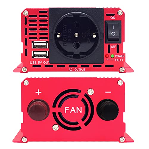 Zwei USB-Anschlüsse. Die 1-EU-Steckdose ist perfekt für die Stromversorgung von Laptop, Fernseher, Ventilator, DVD, GPS, Lampe, Musikinstrument, Solarpanel oder anderen elektronischen Geräten. • Breite Anwendung: Eine 230V-Haushaltsanschlussdose liefert 1000 W Dauerleistung zur Stromversorgung Ihrer Haushaltsgeräte, Elektrowerkzeuge, Bürogeräte, tragbaren Geräte, Fahrzeuge und medizinischen Rettungsgeräte, Kommunikationsgeräte, Notfallgeräte, Yachten usw. • ÜBERLEGENE LANGLEBIGE LEISTUNG: Langlebige Konstruktion und hochwertige Materialien halten rauen Umgebungsbedingungen und allen Jahreszeiten stand, ideal für den Einsatz auf der Straße, auf dem Campingplatz, auf abgelegenen Baustellen oder überall dort, wo Wechselstrom benötigt wird. • Das LCD-Display zeigt den Batteriestatus, die Batteriespannung und die Ausgangsspannung des Wechselrichters an. Es verfügt über USB- und Wechselstromanschlüsse. Der Lüfter läuft weiter, um den Wechselrichter kühl zu halten. Wenn Sie etwas dagegen haben, schalten Sie bitte den Schalter aus. • Der Stromrichter wird mit Batterieklemmen und einem Adapter für den Zigarettenanzünder geliefert. Wenn die Leistung des angeschlossenen AC-Geräts 150 W übersteigt, verwenden Sie bitte den Batterieclip, um es direkt an die Fahrzeugbatterie anzuschließen. • Um die Lebensdauer des Wechselrichters zu gewährleisten, schließen Sie ihn bitte nicht an induktive Lasten wie Mikrowellenherde, Wasserpumpen oder Kaffeemaschinen an. Induktive Lasten benötigen beim Start eine höhere Leistung, wodurch der Wechselrichter beschädigt werden kann.