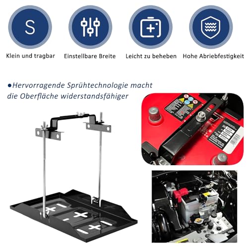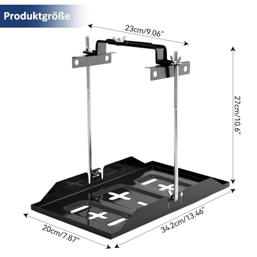 Hochwertiges Material: Der Autobatteriehalter besteht aus hochwertigem Metall mit hoher Festigkeit, guter Tragfähigkeit, ist robust und langlebig, rostfrei, verschleißfest und schlagfest und verspricht eine lange Lebensdauer. • Vertiefter Schlitze Design: Dieses Batteriehalterung Set mit versenkten Schlitzen verhindert, dass die Batterie während des Gebrauchs mit Befestigungselementen kollidiert und zerkratzt wird. Dies gewährleistet eine sichere Batterieverwendung und trägt gleichzeitig zur Wärmeableitung bei. • Verstellbarer Halteklammer: Das batteriefach misst 34,2 x 20 cm, die Schraubstangen sind 27 cm lang, die verstellbare Klemme (Breitenbereich: 135–200 mm) bietet ausreichend Platz für die meisten Standardbatterien. • Universell Batterieträger: Dieses Auto Batterie Träger Halter mit Halteklemmen Set eignet sich für Schiffs-, Wohnmobil-, Wohnmobil-, Anhängerbatterien usw. Es wird häufig in der Automobilreparaturindustrie, Schiffsreparatur usw. verwendet. • Einfache Installation: Ohne Spezialwerkzeug einfach die Batterie platzieren, die Klemme in die entsprechende Position bringen und die Schraube festziehen. Der gesamte Vorgang kann in wenigen Minuten abgeschlossen werden.