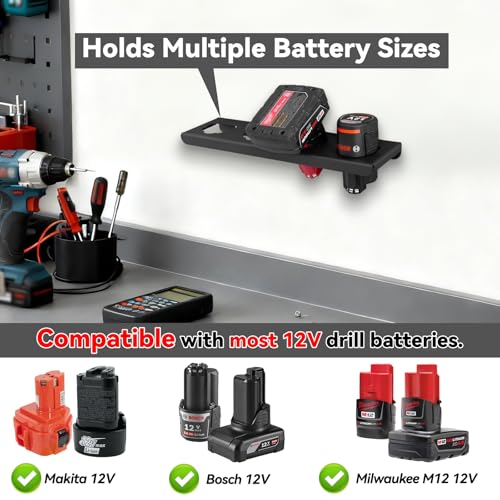 ANGEPASSTE GRÖSSE: Diese Wandhalterung ist speziell kompatibel mit Bosch 12V (2.0Ah, 3.0Ah, 4.0Ah, 6.0Ah, GBA 12V , GBA 10,8V ) Akkus, kompatibel mit Milwaukee 12V (48-11-2460 2.0 Ah )(49-11-2412 3.0 Ah )(48-11-2460 6.0Ah) (48-11-2440 4.0Ah) Akkus, und kompatibel mit Makita 12V (192598-2 2.0Ah), kann bis zu 4 Akkupacks sicher an der Wand halten. HINWEIS: Diese Halterung passt NICHT für andere Marken oder Arten von Akkus. Bitte überprüfen Sie die Kompatibilität vor dem Kauf. • DURCHDACHTES DESIGN: Dieser Akkuhalter hat abgerundete Ecken an allen Kanten, um ein Verkratzen der Akkus oder Ihrer Finger zu vermeiden. • FEINE VERARBEITUNG: Diese Halterung ist aus 1,7 mm dickem Stahlblech gefertigt und die Oberfläche ist pulverbeschichtet, um das Stahlblech zu schützen, was ihm eine hochwertige Textur und Haptik verleiht. Sie ist robust und langlebig und rostet oder korrodiert nicht bei feuchten und hohen Temperaturen. • VIELSEITIGE ANWENDUNG: Organisieren Sie Ihren Raum mit dieser Halterung, die Ihre kompatiblen DeWalt- und Milwaukee-Akkus an Lochwänden und Wänden montieren kann, so dass sie leicht zugänglich sind. Ob es sich um eine Garage, Werkstatt, Zuhause, Schuppen, Geschäft handelt, dies ist ein ideales Aufbewahrungswerkzeug. • EINFACHE MONTAGE: Jedes Produkt enthält 1 * Bohrmaschinen-Akkuhalter + 4 Sets * Dübelschrauben. Das längliche Lochdesign ermöglicht es Ihnen, es an verschiedenen Lochwänden zu montieren, was es zu einer perfekten Lösung für die Aufbewahrung von Werkzeugen macht.